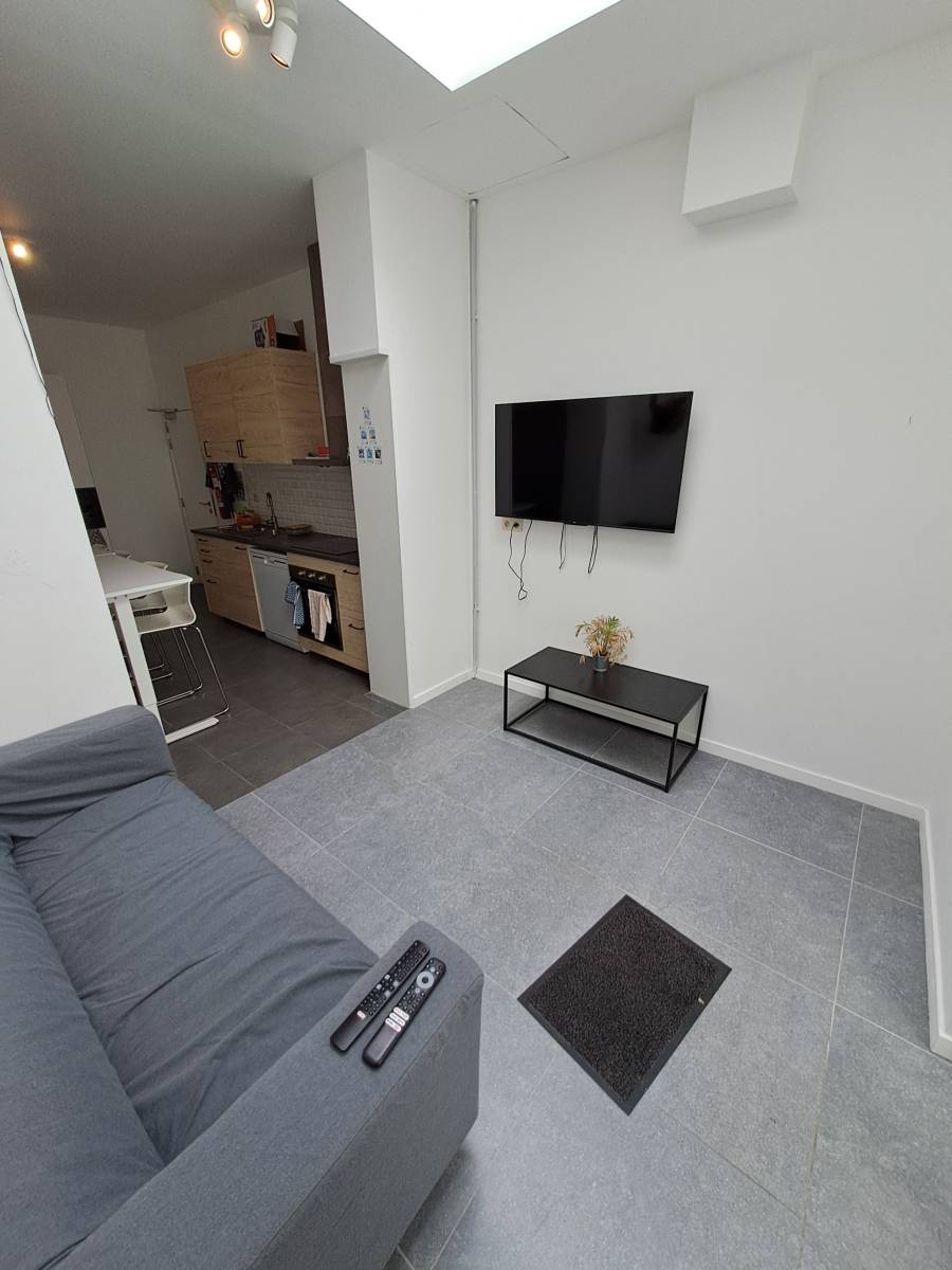 Er is ook een gezellige leefruimte met comfortabele zetel en televisie — perfect om samen te ontspannen na een lange dag studeren of les volgen.