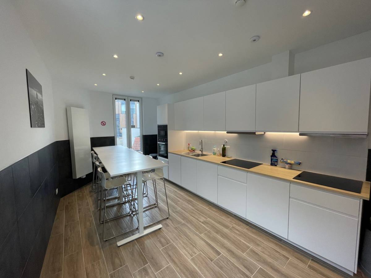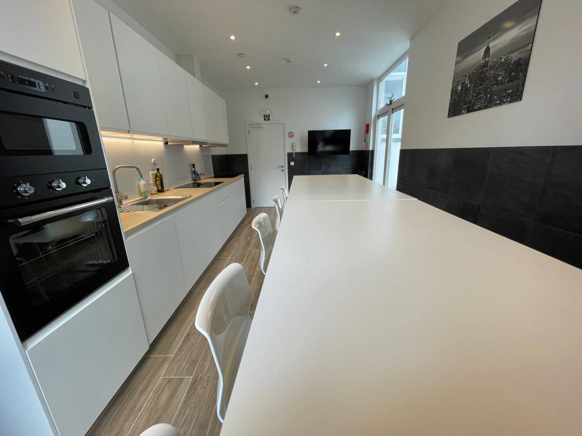 Het gebouw beschikt over een supersnel business wifi-netwerk en een gezellige gemeenschappelijke keuken, uitgerust met bartafels, oven, microgolf, inductiekookplaten, een vaatwasser en een flatscreen-tv — ideaal om samen te koken en ontspannen.