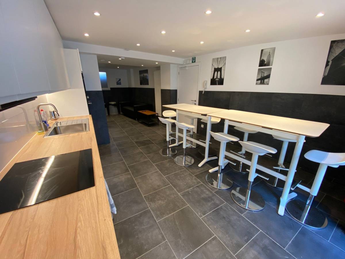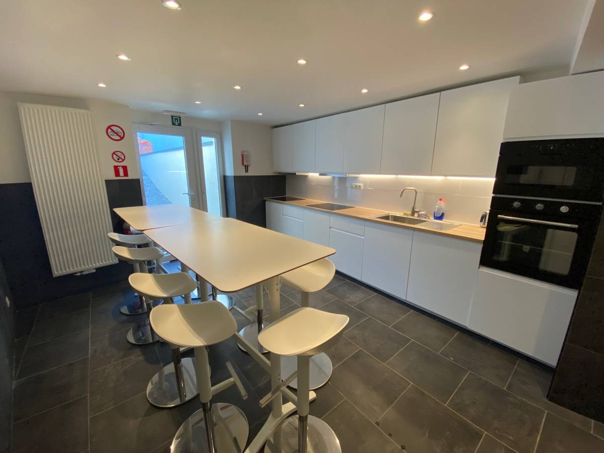 De gemeenschappelijke keuken is volledig ingericht met een bartafel, oven, microgolf, inductiekookplaat en afwasmachine.