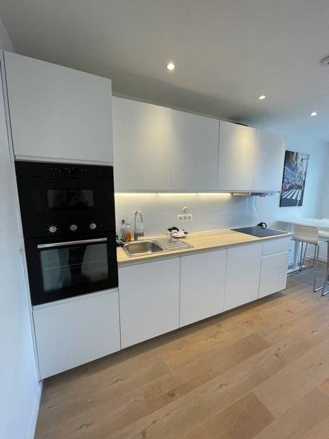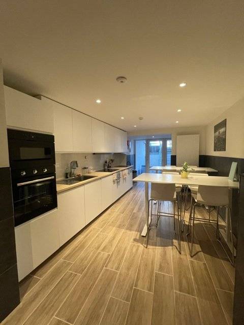 Op verdieping -1 vind je een gezellige keuken en zitruimte, ingericht met bartafels, oven, microgolf, inductiekookplaten, een vaatwasser, een zitbank en een smart-tv.