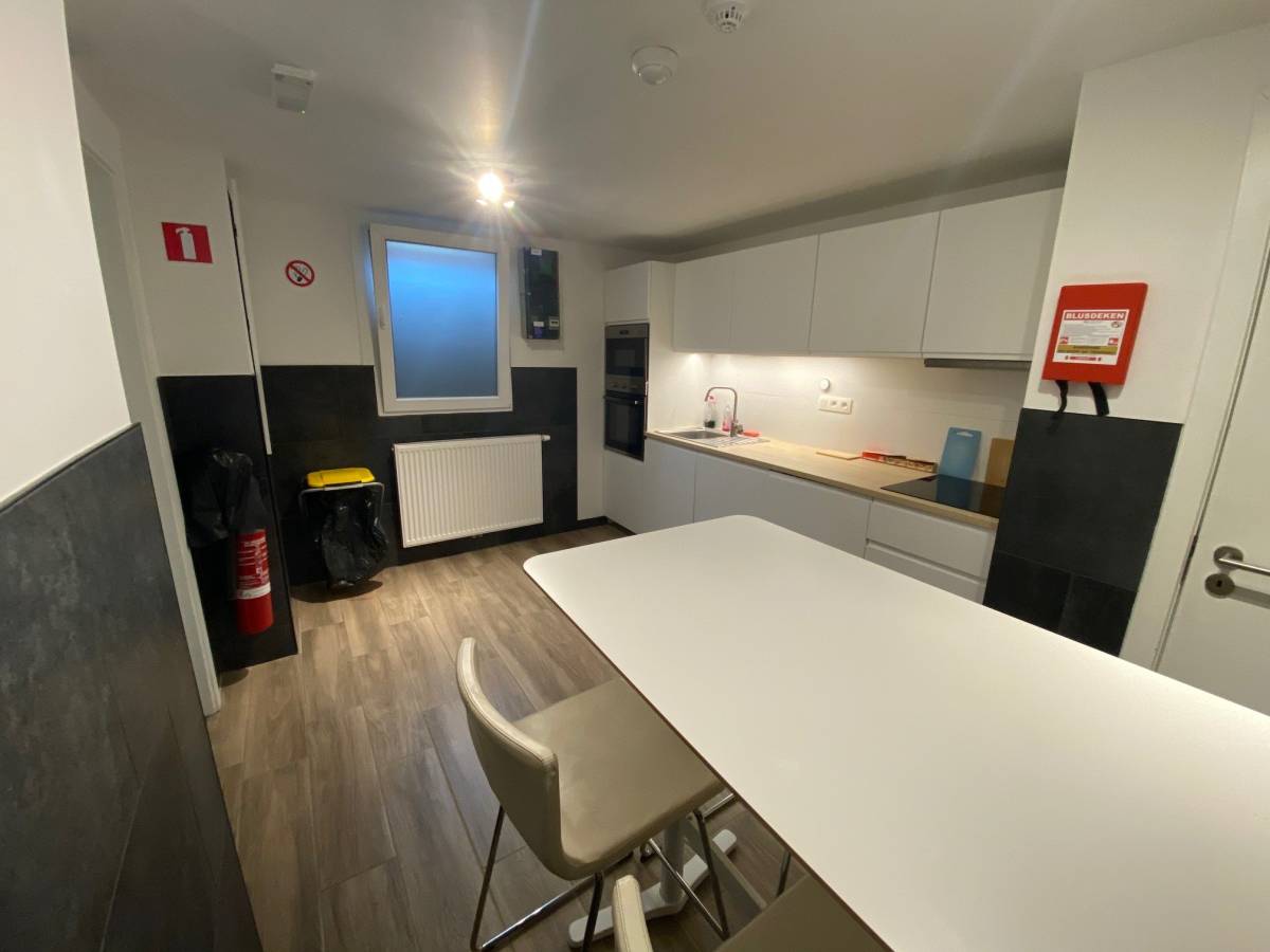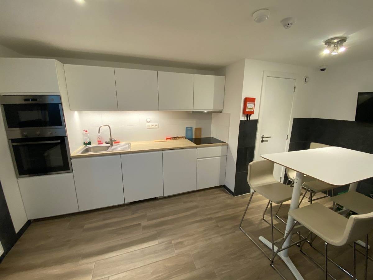 De gemeenschappelijke keuken is ingericht met een verhoogde bartafel, stoelen, een oven, microgolf en inductiekookplaat.