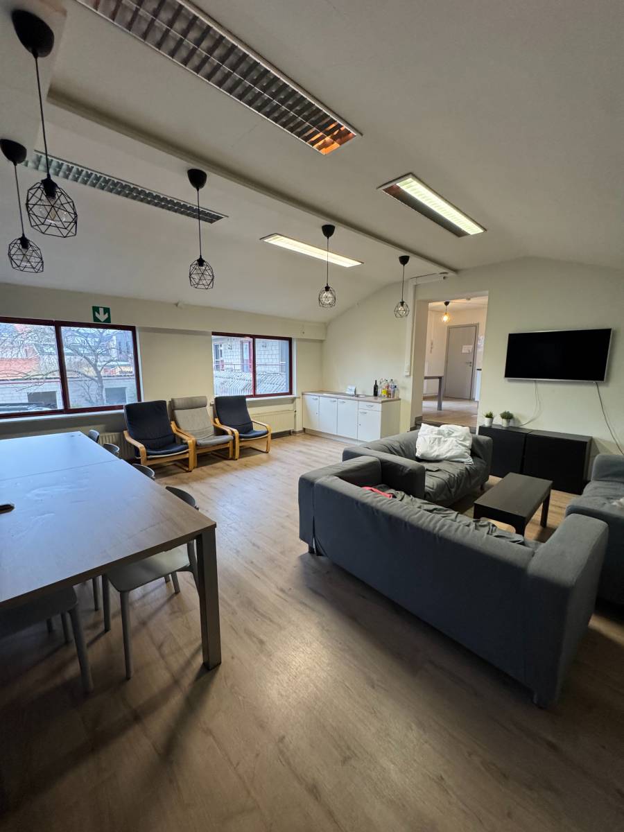Naast de individuele woonruimtes is er een gezellige gemeenschappelijke ruimte waar studenten elkaar kunnen ontmoeten, samen kunnen studeren of gewoon even kunnen ontspannen.