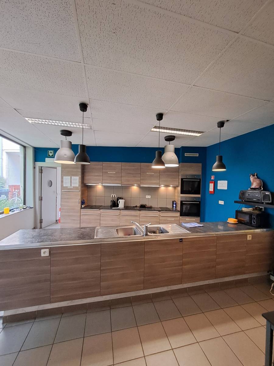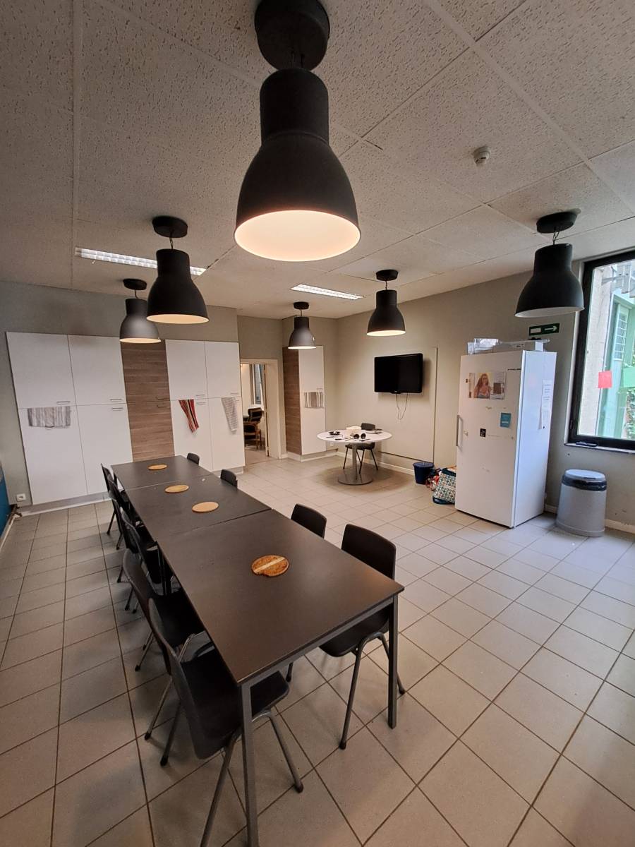 Op het gelijkvloers vind je de ruime, gemeenschappelijke keuken met aansluitend een gezellige zit- en studieruimte — én zelfs een pingpongzaaltje voor wat ontspanning tussendoor.