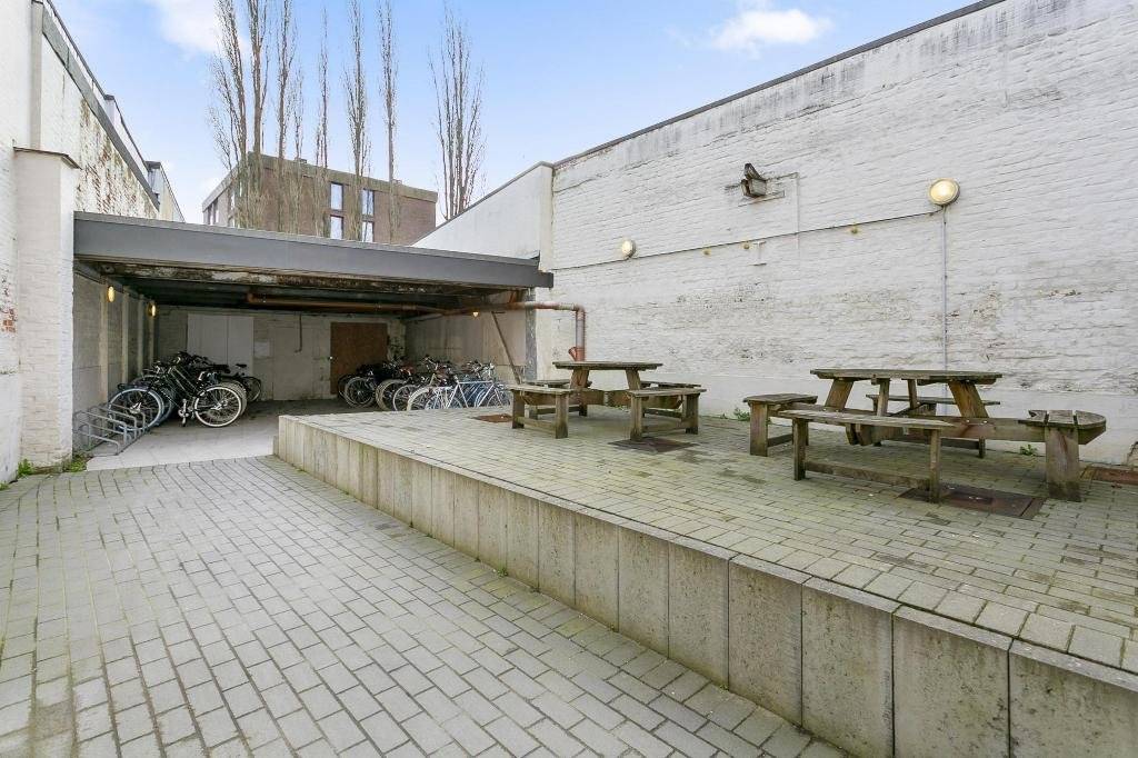 Achteraan vind je een groot terras met picknicktafels en voldoende ruimte voor fietsen — een mooie extra troef voor ontspanning en praktisch gebruiksgemak.