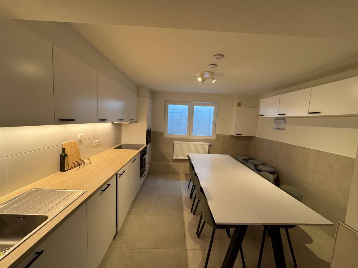 Op verdieping -1 bevindt zich een ruime gemeenschappelijke keuken met voldoende plaats voor alle bewoners, én een gezellige zithoek waar je kunt koken, eten of ontspannen met medestudenten.