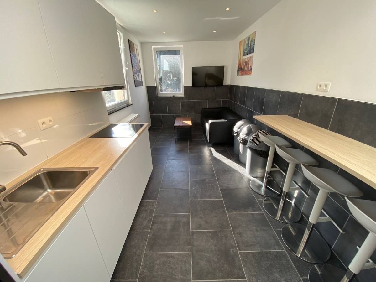 De gemeenschappelijke keuken is volledig ingericht met een bartafel, oven, microgolf, inductiekookplaat en afwasmachine.